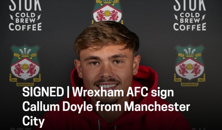 雷克瑟姆官方:曼城21岁后卫多伊尔加盟,据悉转会费750万镑