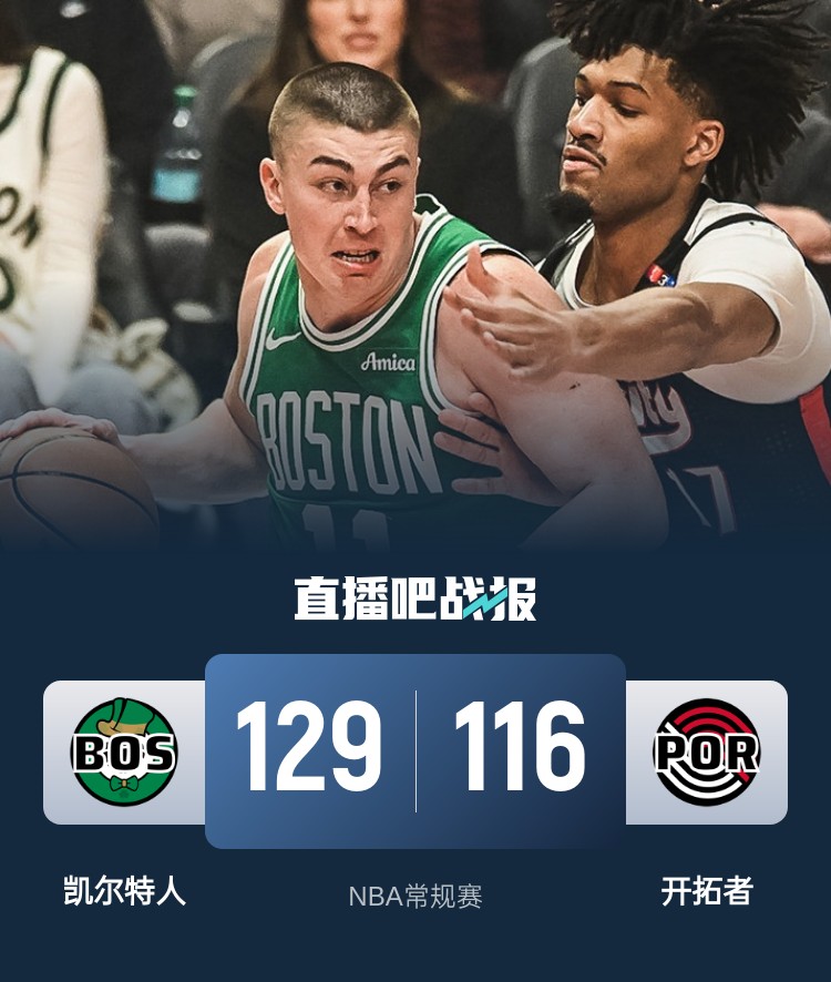 比赛开始,普理查德上来连续被吹犯规很快3犯下场,双方外线连续对飙,凯尔特人更胜一筹,塔图姆接连送助攻带队首节领先10分,次节开拓者发力连续反击一波12-0直接追平比分,霍福德接连中远投止血,绿军回应9-0稳住领先优势,随后凯尔特人外线继续发炮半场领先13分。第三节,塔图姆开始发力,里突外投单节轰下18分,凯尔特人一度拉开近20分领先,但顽强的开拓者还是追到差12分,末节双方继续对攻战,外线你来我往,但凯尔特人始终保持十几分领先,最终凯尔特人129-116力克开拓者,拿到5连胜同时终结对手4连胜。