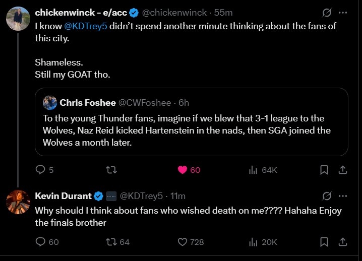 网友Chris Foshee:对于年轻的雷霆球迷来说,想象一下,如果我们3-1领先然后被森林狼逆转了,里德还踢了哈尔滕施泰因的要害,然后SGA一个月后加盟了森林狼……(暗示16年勇士曾逆转雷霆、之后KD加盟勇士)。