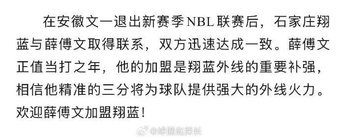 @球圈赵探长 在个人微博上写道:“在河北翔蓝官宣薛傅文加盟的文章里,间接确认了安徽文一退出新赛季NBL(如下图)。听到这样的消息总是很惋惜,像陕西信达、安徽文一这样的大俱乐部陆续离开,意义不言而喻,是很不好的信号。