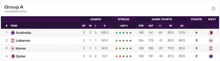 韩国男篮目前1胜1负,排名小组第3,小组赛最后一场他们将和黎巴嫩男篮正面对决。