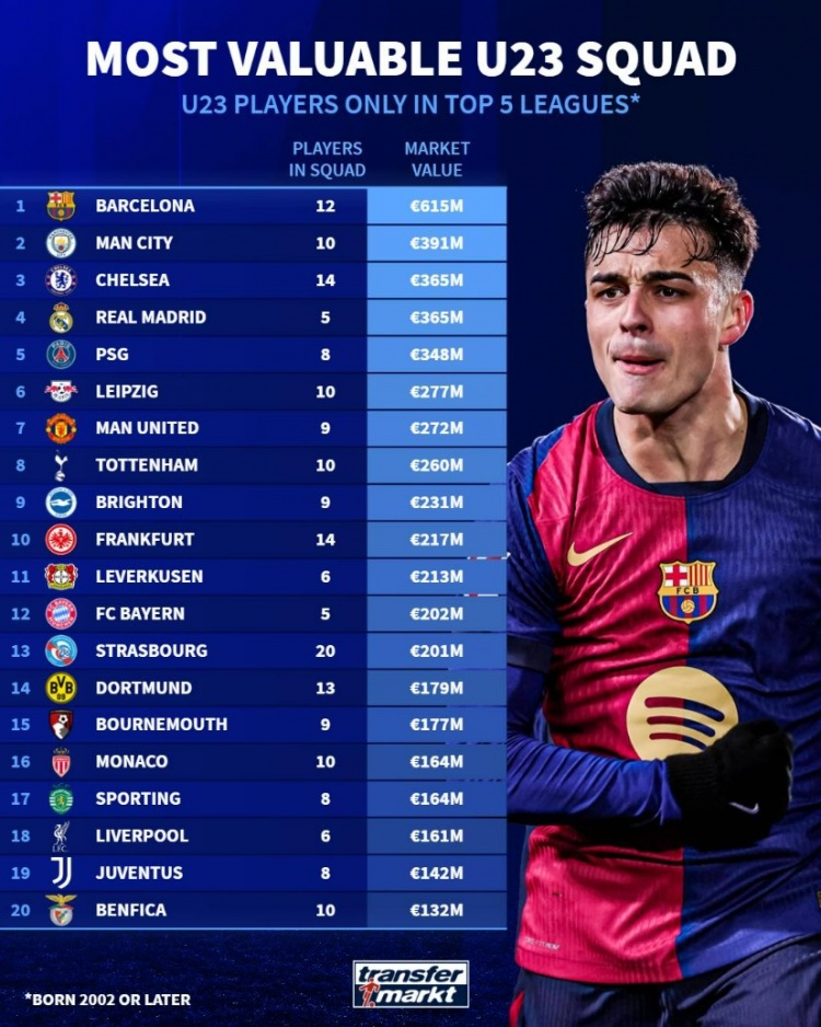 4月5日讯 德转盘点了五大联赛球队中,所有U23球员身价最贵榜单,其中巴萨12位U23球员身价之和达到6.15亿欧高居榜首,具体榜单如下(队内U23球员人数+身价之和):
