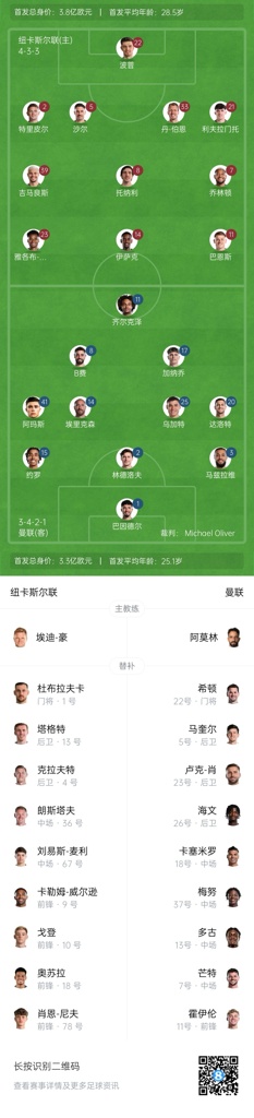 纽卡首发:22-波普、2-特里皮尔、5-沙尔、21-利夫拉门托、33-丹-伯恩、7-乔林顿、8-托纳利、23-墨菲、39-吉马良斯、11-哈维-巴恩斯、14-伊萨克