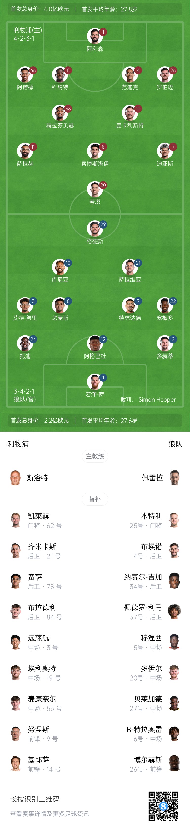 利物浦首发:1-阿利森、4-范迪克、5-科纳特、26-罗伯逊、66-阿诺德、8-索博斯洛伊、10-麦卡利斯特、38-赫拉芬贝赫、7-路易斯-迪亚斯、11-萨拉赫、20-若塔