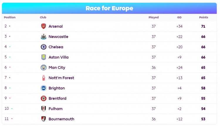 前七名球队将确保参加欧洲赛事,但只有前五名才能获得欧冠席位。目前,排名第三至第七的五支球队之间仅相差一分。 此外,第八至第十一名之间的四支球队也仅有五分之差,而第八名仍有可能获得欧洲赛事资格。