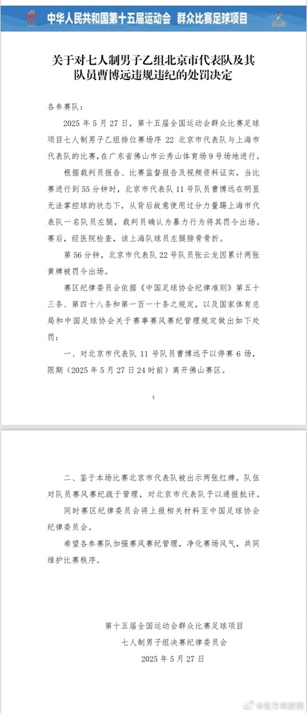 一、对北京市代表队11号队员曹博远予以停赛6场,限期(2025年5月27日24时前)离开佛山赛区。