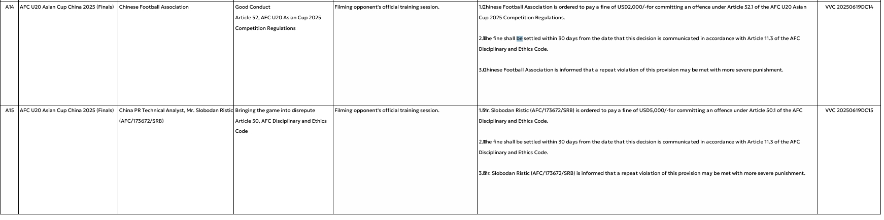 1.中国足协违反《2025U20亚洲杯竞赛规程》第52.1条规定,被罚款2000美元。