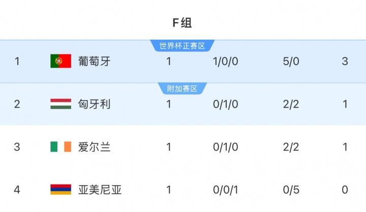 世预赛欧洲区,F组还剩5场比赛,葡萄牙的同组对手包括匈牙利、爱尔兰和亚美尼亚。