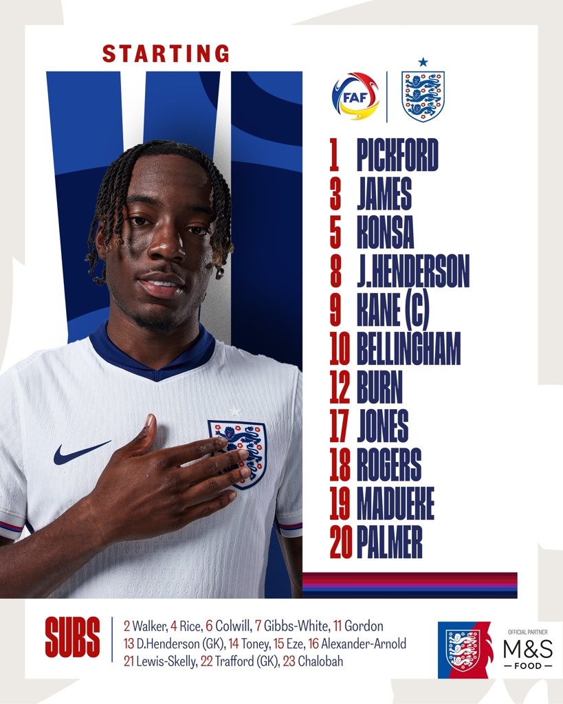 英格兰vs安道尔首发:詹姆斯左后卫&琼斯右后卫,凯恩&贝林出战
