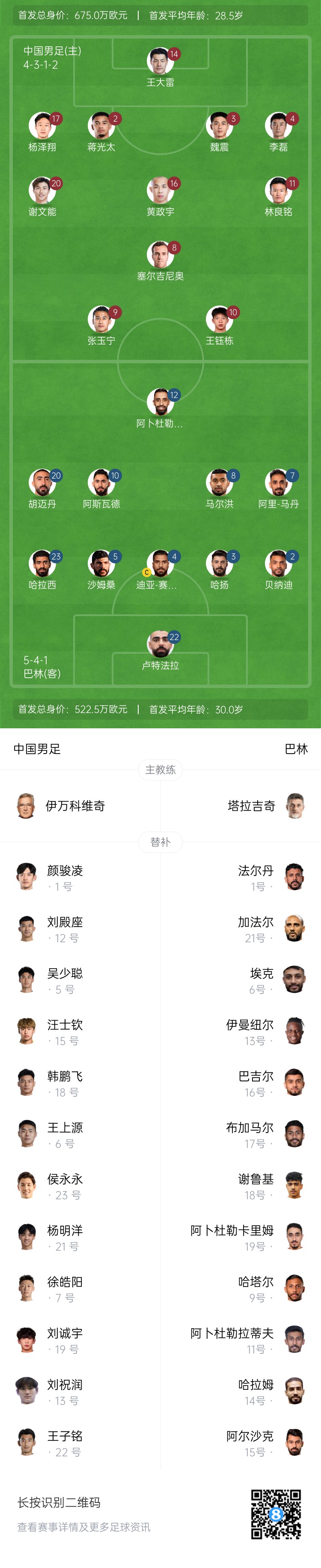 国足vs巴林首发对比:平均年龄28.5岁-30岁,身价675万欧-522.5万